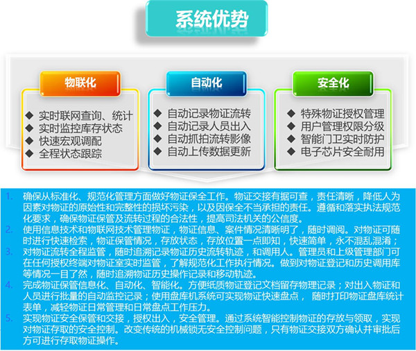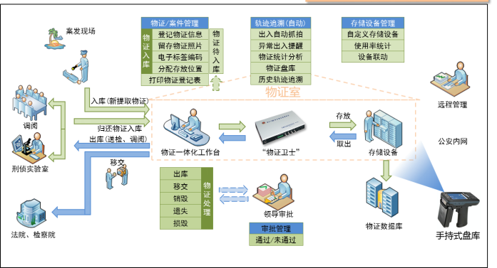 系統(tǒng)可架設在公安內網上,公、檢、法、司各級部門可在公安內網查詢保全管理信息,為預審或庭審人員提供有效的示證支持,大大降低預審或庭審中實物出示率。延伸專屬網絡互聯(lián)系統(tǒng),在確保網絡安全的前提下,與相關偵查機關、審判機關實現(xiàn)涉案財物信息網絡傳輸,以降低移轉環(huán)節(jié)可能發(fā)生的對實物的損毀、滅失、變性等情況。同時,也可滿足提前查驗實物的數字化信息,再由接收機關決定具體移轉哪些實物。部門領導可在內網中進行證物處理審批,有效加強了執(zhí)法辦案流程的規(guī)范性。粘貼上RFID電子標簽的涉案財物信息都會被錄入系統(tǒng),公檢法三方均可通過內網內實時監(jiān)管涉案財物情況,并通過系統(tǒng)隨案移送單據,法院還可在庭審時遠程調用涉案財物信息。涉案財物管理中心將配備必要的拍照或錄像設備,對集中保管的財物拍照或者錄像編號存查,和RFID標簽一起保證了三家單位對管理中心和涉案財物隨時監(jiān)控,大大提高了辦案效率,增強被保管物品的“可靠性”。